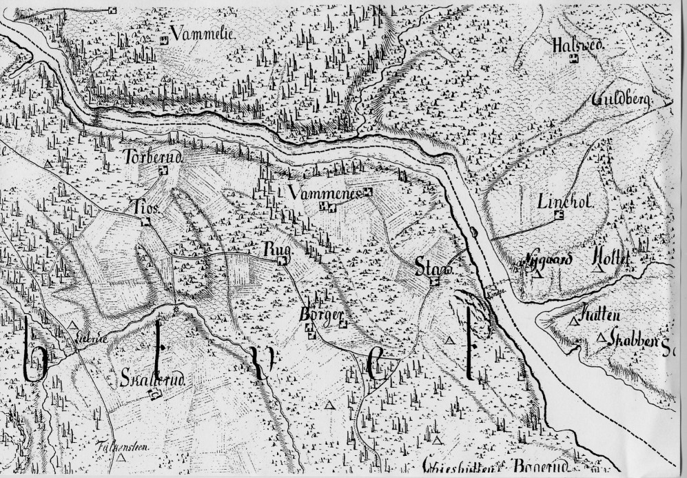 Kartet viser plassering av noen husmannsplasser. Det er også artig at lensa ved Lindhol er tegnet inn. Haltsvet er en gård, og Nordeng finnes ikke.