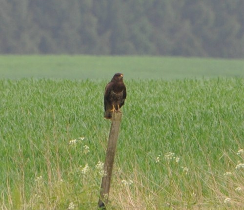 En musvåk hadde forspist seg og ville hvile seg litt, men fremdeles på vakt. Den oppdaget iallefall fotografen ganske raskt selv på 200 meters hold bak en busk. |