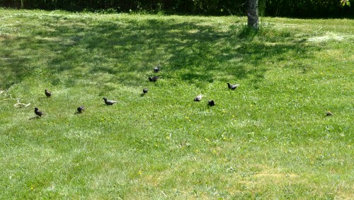 Svarttrosten er en flittig besøkende på plenen. Her driver den opplæring av ungene til å spise selv. Ungene er så store at de kan fly, men kan tydeligvis ikke finne seg mat selv. |