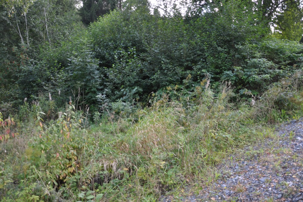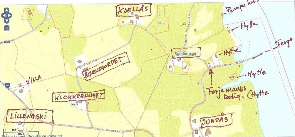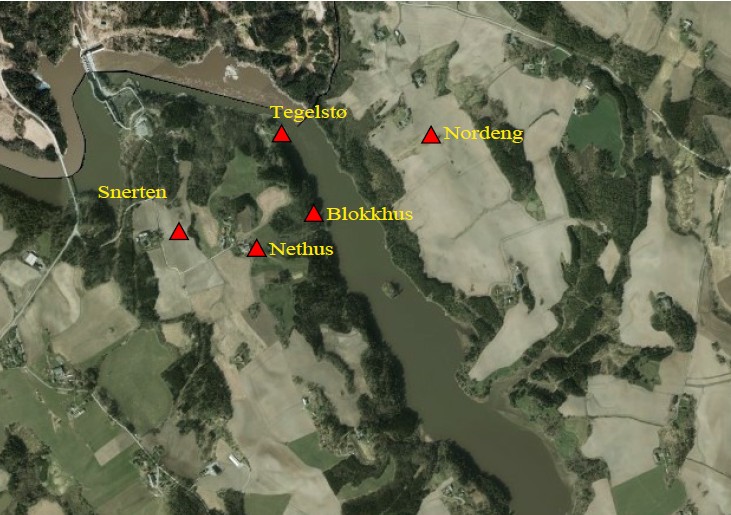 Ovnen på Tegelstø idag ligger inne i buskaset her på bildet ved Strømnes ned mot elva. Leira ble hentet på holen på oversiden. Flere bilder kan du se her.
