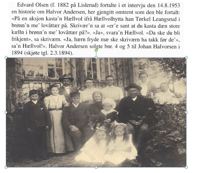 Mellom Andreas og Torkel på bildet sitter deres kusine og Andreas sin kone Martine. Martine var datter av Torkel og Andreas sin farbror Halvor. Halvor og brødrenes far John var født og vokste opp på Reiershullet (Veiby) litt oppstrøms Grønnsund i Skiptvet, og det skulle bli flere sterke etterkommere.