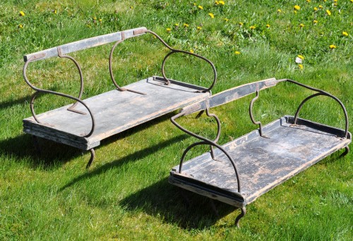 Her har vi en toseter , tydeligvis parkert for godt idag, men grei å ha på 18-1900 tallet. Bak til høyre sees en brems som ble brukt til å bremse slik at sleden ikke slang sideveis. Kusken satt på det lille setet helt bakerst, mens det var plass til 2 stykker i hovedsetet.